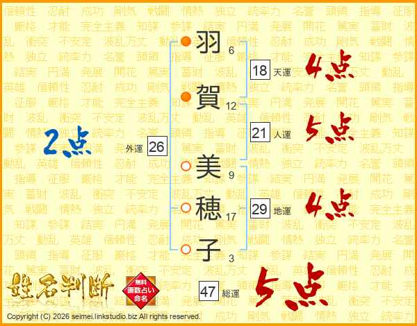 羽(6画)賀(12画) 美(9画)穂(17画)子(3画)