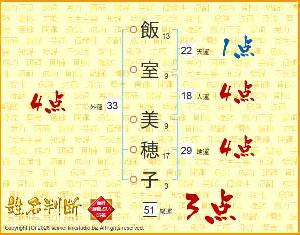 飯(13画)室(9画) 美(9画)穂(17画)子(3画)