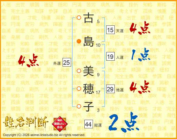 古(5画)島(10画) 美(9画)穂(17画)子(3画)