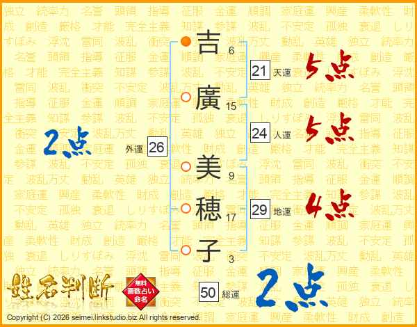 吉(6画)廣(15画) 美(9画)穂(17画)子(3画)