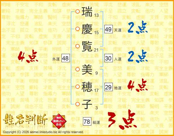 瑞(13画)慶(15画)覧(21画) 美(9画)穂(17画)子(3画)