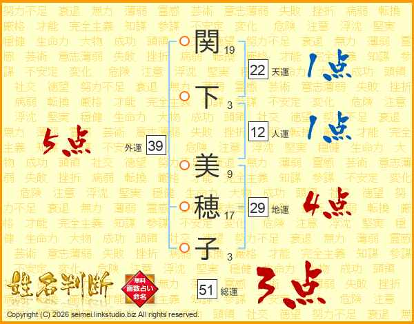関(19画)下(3画) 美(9画)穂(17画)子(3画)