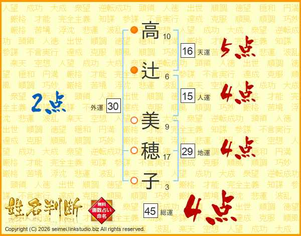 高(10画)辻(6画) 美(9画)穂(17画)子(3画)