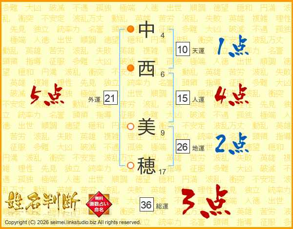 生活面を象徴する運勢です。外部から受ける影響力を表し、結婚運、家庭運や職場、環境への順応性を表します。総運から人運を引いた画数。姓や名が1文字の場合を除く。