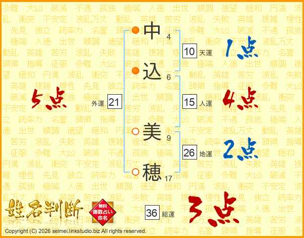 中(4画)込(6画) 美(9画)穂(17画)