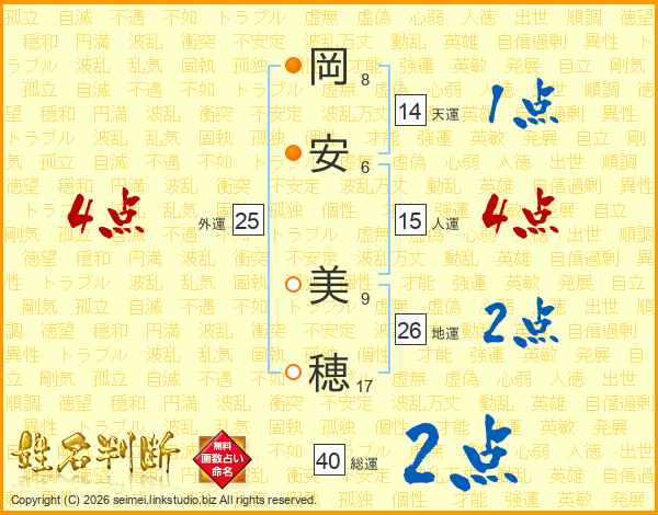 生活面を象徴する運勢です。外部から受ける影響力を表し、結婚運、家庭運や職場、環境への順応性を表します。総運から人運を引いた画数。姓や名が1文字の場合を除く。