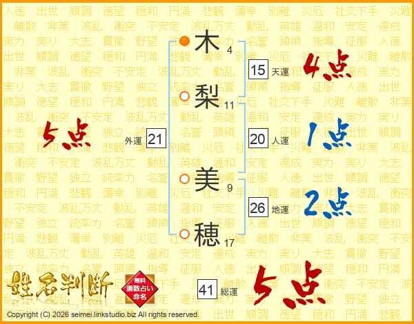 木(4画)梨(11画) 美(9画)穂(17画)