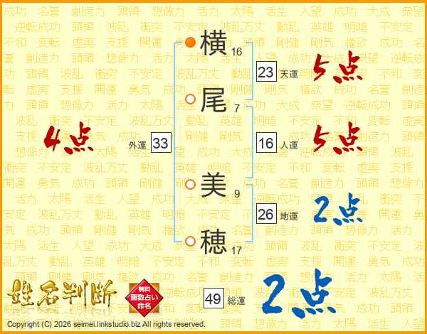 生活面を象徴する運勢です。外部から受ける影響力を表し、結婚運、家庭運や職場、環境への順応性を表します。総運から人運を引いた画数。姓や名が1文字の場合を除く。
