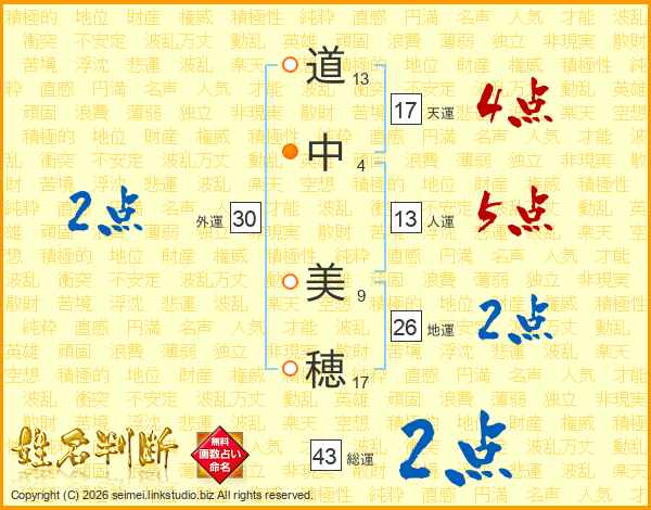 生活面を象徴する運勢です。外部から受ける影響力を表し、結婚運、家庭運や職場、環境への順応性を表します。総運から人運を引いた画数。姓や名が1文字の場合を除く。