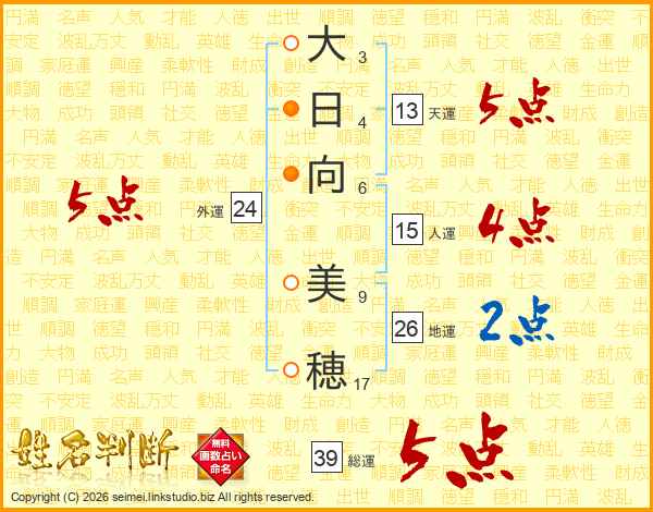 大(3画)日(4画)向(6画) 美(9画)穂(17画)