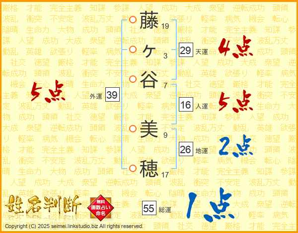 藤(19画)ヶ(3画)谷(7画) 美(9画)穂(17画)