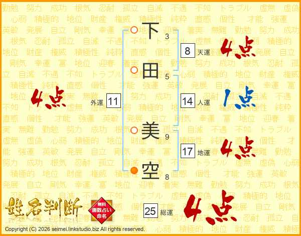 生活面を象徴する運勢です。外部から受ける影響力を表し、結婚運、家庭運や職場、環境への順応性を表します。総運から人運を引いた画数。姓や名が1文字の場合を除く。