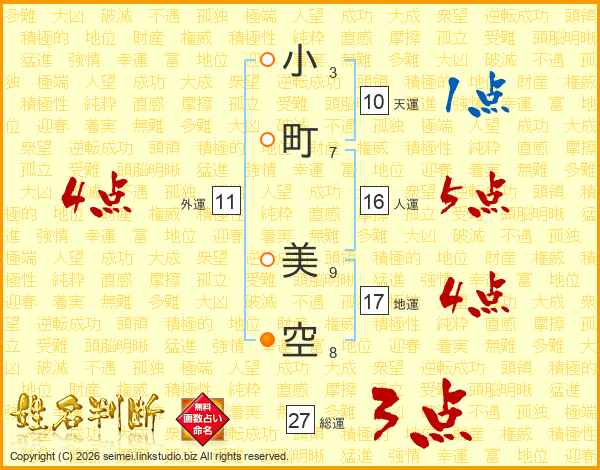 生活面を象徴する運勢です。外部から受ける影響力を表し、結婚運、家庭運や職場、環境への順応性を表します。総運から人運を引いた画数。姓や名が1文字の場合を除く。