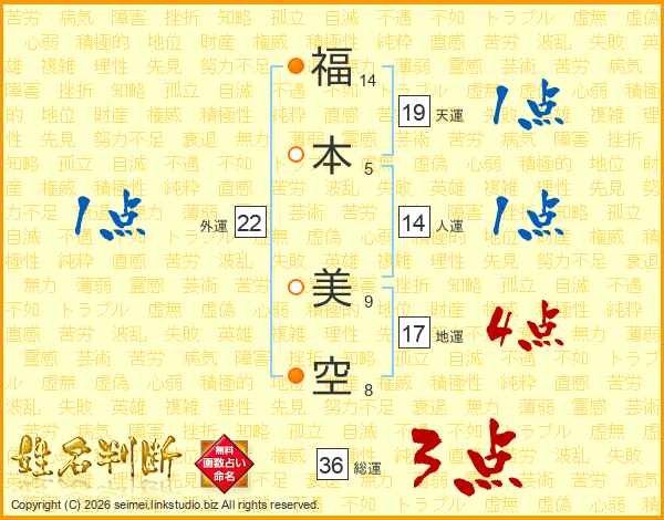 生活面を象徴する運勢です。外部から受ける影響力を表し、結婚運、家庭運や職場、環境への順応性を表します。総運から人運を引いた画数。姓や名が1文字の場合を除く。
