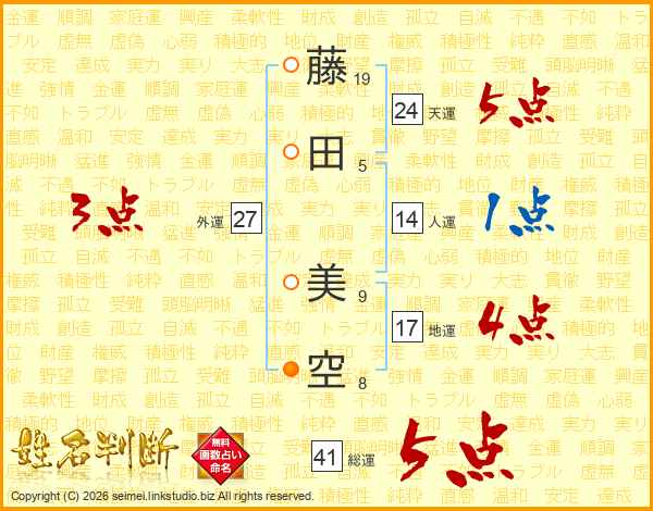生活面を象徴する運勢です。外部から受ける影響力を表し、結婚運、家庭運や職場、環境への順応性を表します。総運から人運を引いた画数。姓や名が1文字の場合を除く。