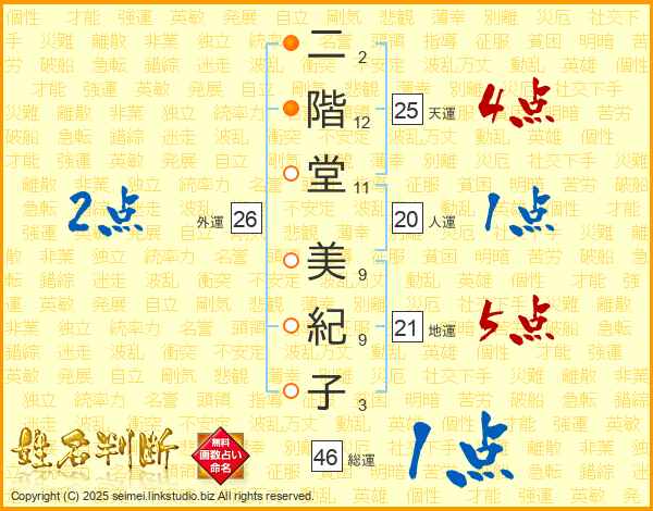 二(2画)階(12画)堂(11画) 美(9画)紀(9画)子(3画)