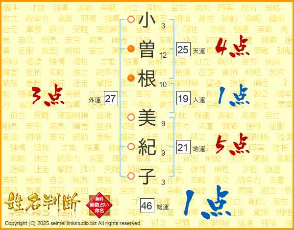 小(3画)曽(12画)根(10画) 美(9画)紀(9画)子(3画)