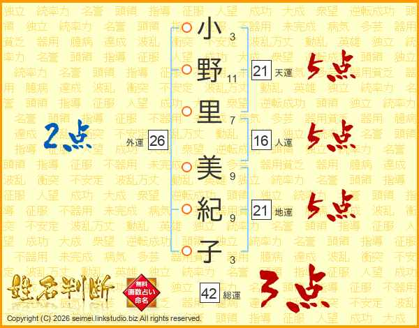 小(3画)野(11画)里(7画) 美(9画)紀(9画)子(3画)