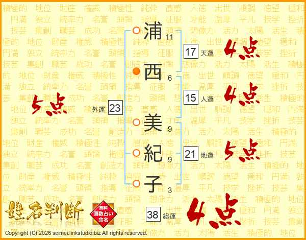 浦(11画)西(6画) 美(9画)紀(9画)子(3画)