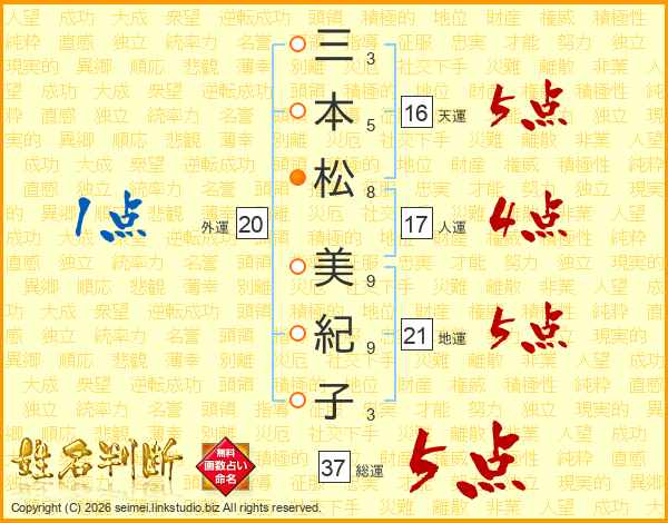 三(3画)本(5画)松(8画) 美(9画)紀(9画)子(3画)