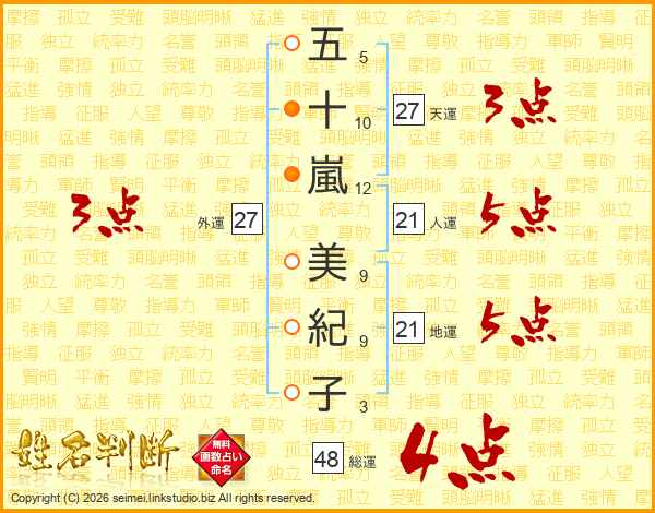 五(5画)十(10画)嵐(12画) 美(9画)紀(9画)子(3画)