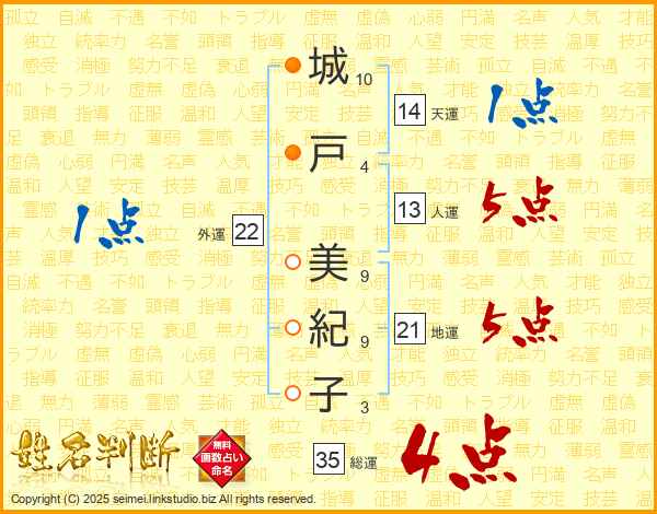 城(10画)戸(4画) 美(9画)紀(9画)子(3画)