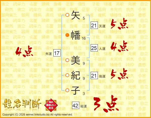 矢(5画)幡(16画) 美(9画)紀(9画)子(3画)