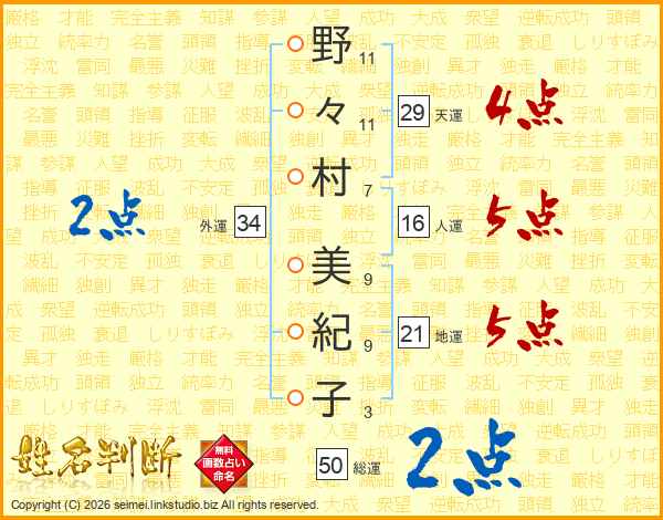 野々村美紀子さんの地運は21画の5点!
