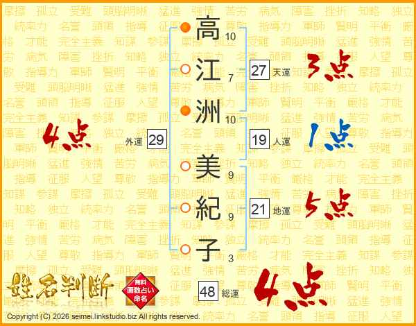 高(10画)江(7画)洲(10画) 美(9画)紀(9画)子(3画)