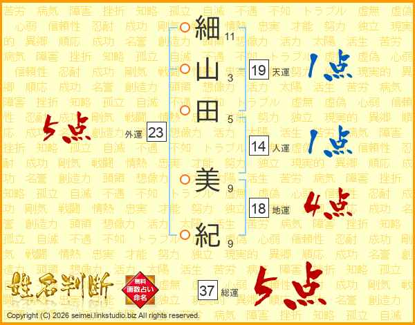 細(11画)山(3画)田(5画) 美(9画)紀(9画)