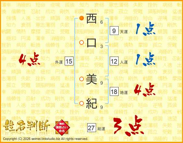 画数の奇数(○陽)と偶数(●陰)の配列で吉凶を占います。どちらかにかたよる名前は大凶名で避ける必要があります。画数の奇数偶数。