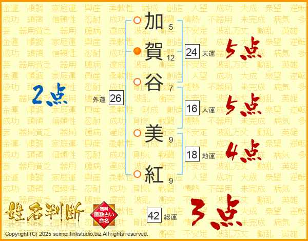 加(5画)賀(12画)谷(7画) 美(9画)紅(9画)
