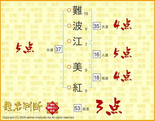 難(19画)波(9画)江(7画) 美(9画)紅(9画)