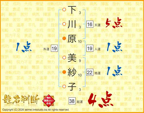 生活面を象徴する運勢です。外部から受ける影響力を表し、結婚運、家庭運や職場、環境への順応性を表します。総運から人運を引いた画数。姓や名が1文字の場合を除く。