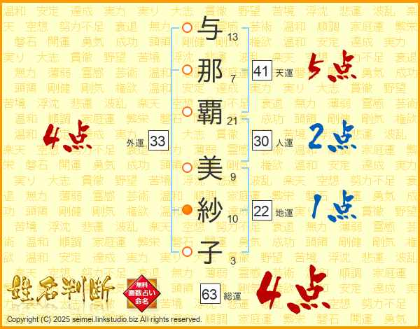 与(13画)那(7画)覇(21画) 美(9画)紗(10画)子(3画)