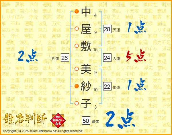 中(4画)屋(9画)敷(15画) 美(9画)紗(10画)子(3画)