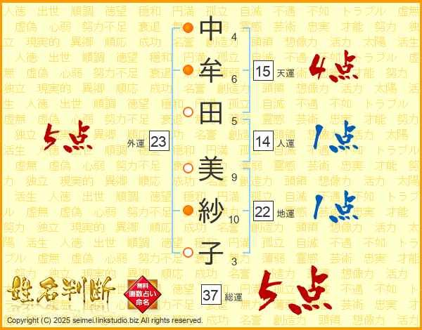 中(4画)牟(6画)田(5画) 美(9画)紗(10画)子(3画)