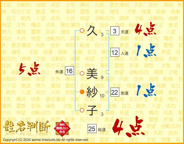 久(3画) 美(9画)紗(10画)子(3画)