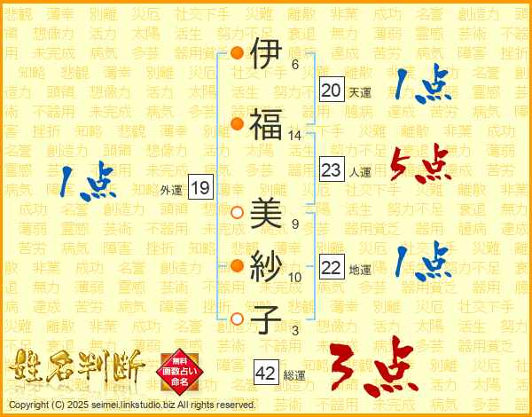 伊(6画)福(14画) 美(9画)紗(10画)子(3画)
