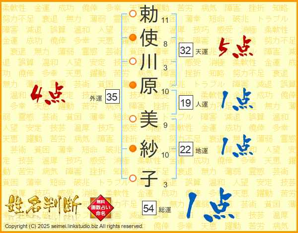 勅(11画)使(8画)川(3画)原(10画) 美(9画)紗(10画)子(3画)