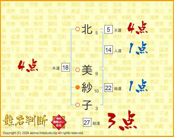 北(5画) 美(9画)紗(10画)子(3画)