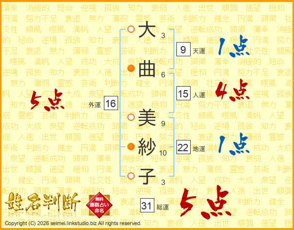 大(3画)曲(6画) 美(9画)紗(10画)子(3画)