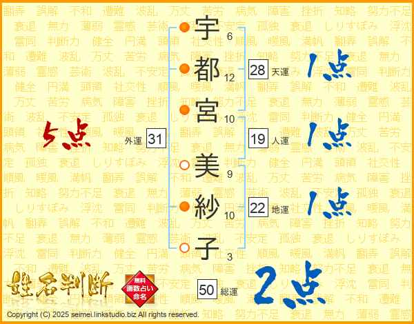 宇(6画)都(12画)宮(10画) 美(9画)紗(10画)子(3画)
