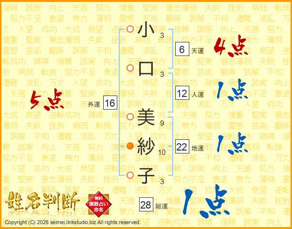 小(3画)口(3画) 美(9画)紗(10画)子(3画)