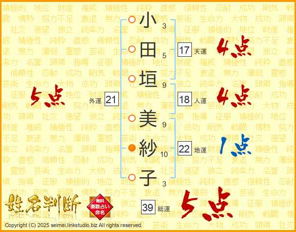 小田垣美紗子さんの総運は39画の5点!