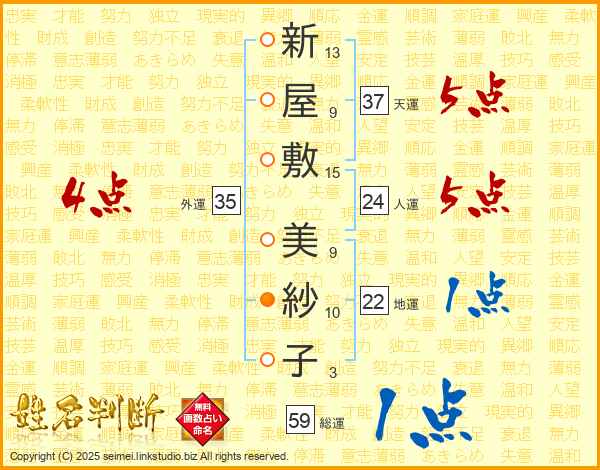 新(13画)屋(9画)敷(15画) 美(9画)紗(10画)子(3画)