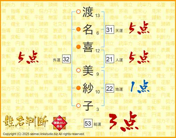 渡(13画)名(6画)喜(12画) 美(9画)紗(10画)子(3画)