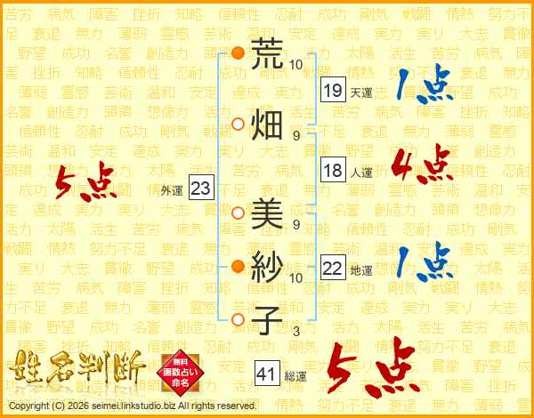 荒(10画)畑(9画) 美(9画)紗(10画)子(3画)
