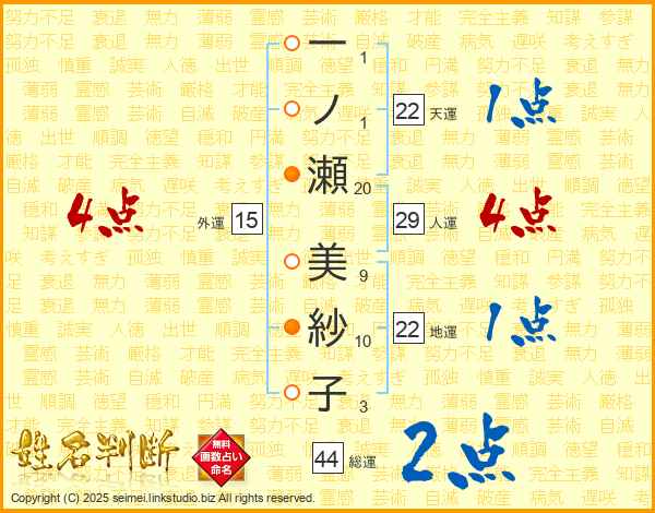 一ノ瀬美紗子さんの総運は44画の2点!