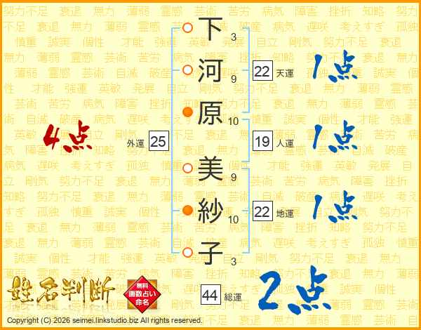 下河原美紗子さんの総運は44画の2点!